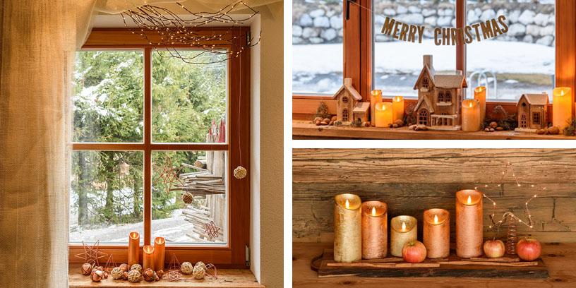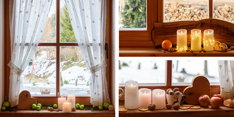 Ya hemos visto que cuando tienes velas bonitas no necesitas mucho más, pero para acentuar la decoración navideña puedes utilizar adornos en forma de estrella como nuestro puntal con luces Led, una rama luminosa en la parte superior para darle armonía o recrear un pueblo de las montañas en el poyete de la ventana.