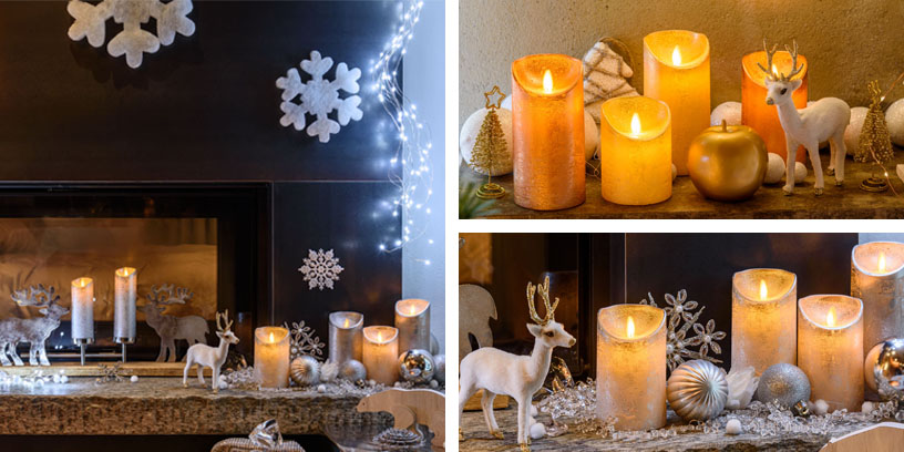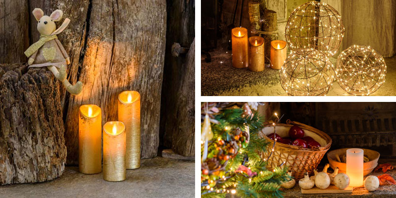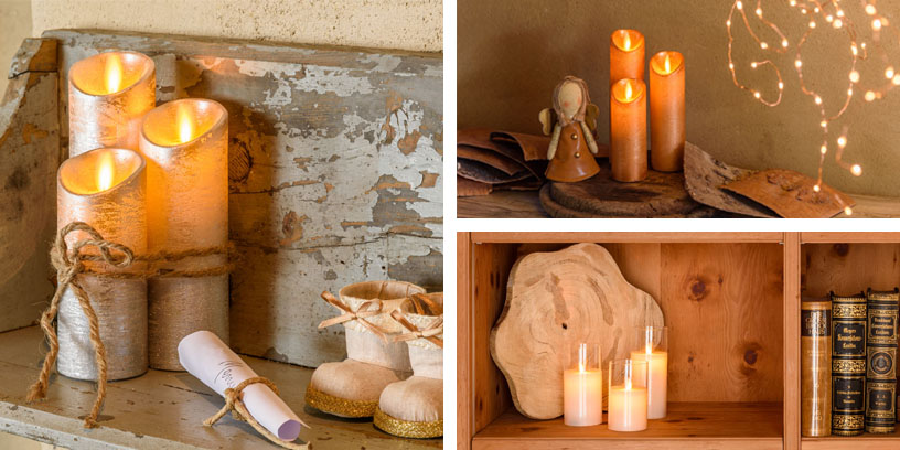 Las velas rústicas con acabados metálicos quedan ideales pero también las que tienen el vaso de cristal. Eso sí, todas son velas con llama móvil que resultan mucho más reales.