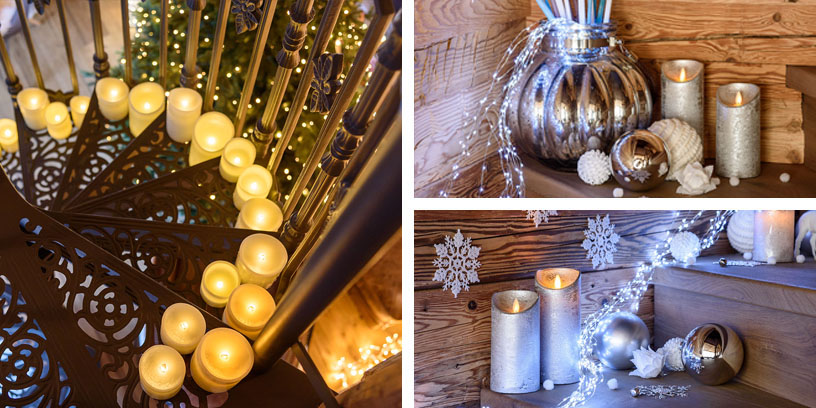 Si no sabes cómo decorar la escalera durante las fiestas o estás buscando una solución rápida, las velas navideñas son tu respuesta. Puedes crear un camino luminoso en las escaleras o decorar determinados ángulos.