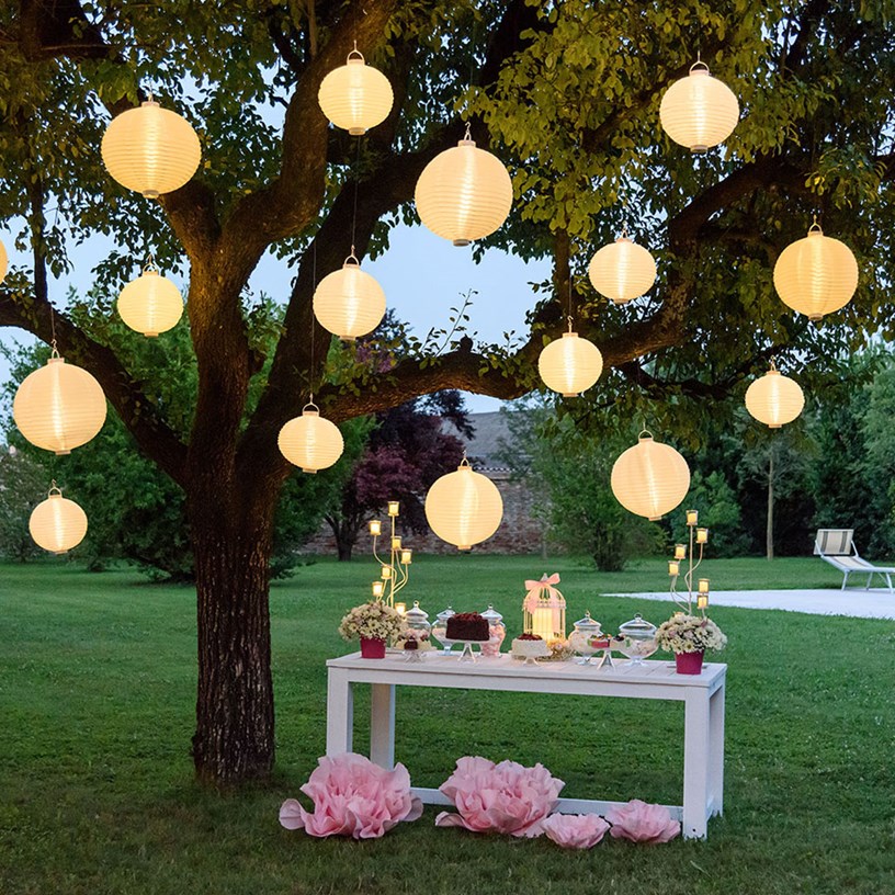 Farolillos de tela que se iluminan para crear una atmósfera especial y diferenciar el rincón de la mesa de los dulces del resto del jardín. Nosotros los pusimos en blanco pero también los puedes encontrar en rosa, turquesa o amarillo. Éstos funcionan a pilas, pero también puedes crear un ambiente especial con los farolillos solares. Se encenderán automáticamente al caer la tarde.