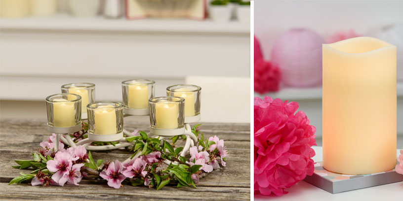 Para dar armonía a la decoración, dos candelabros a los extremos y una vela dentro de una jaula con las mismas flores. Todas las velitas led a pilas, para que los más pequeños puedan acercarse y jugar sin peligro;