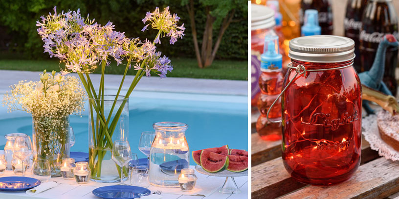 Como última propuesta, para los más alegres, tarros de colores con luces en su interior. Los puedes colocar en la mesa de las bebidas, aperitivo o en la zona del buffet libre. A los niños les encantará por sus colores. Y a los adultos por ese carácter mágico que nos hace volver a la infancia.