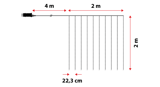 La cortina está equipada con 400 led color blanco cálido de 5 mm de diámetro, dispuestos verticalmente a lo largo de un cable transparente. Esta disposición de los led permite resaltar más el efecto de nevada.