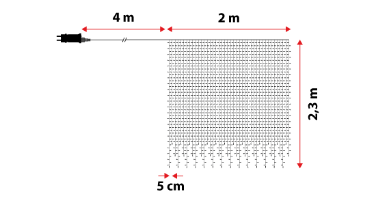 La cortina está equipada con 1680 led blanco cálido, cada uno con un diámetro de 5 mm, soldados en un cable transparente. Los led están colocados con un espacio de solo 5 centímetros entre sí, al igual que las tiras, garantizando una luminosidad intensa y uniforme. La característica distintiva de esta cortina radica tanto en el gran número de luces, ya que son mucho más densas que otras cortinas de la misma serie, como en la irregularidad de la altura de las tiras, que están ligeramente escalonadas, creando un efecto dinámico y original.