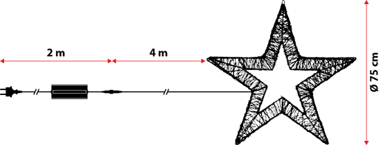 La estrella funciona a baja tensión a través del transformador incluido y se suministra con un cómodo cable de alimentación de 6 metros de largo, lo que permite colocarla fácilmente incluso lejos de las tomas de corriente. Además, cuenta con un gancho de sujeción que facilita la instalación.