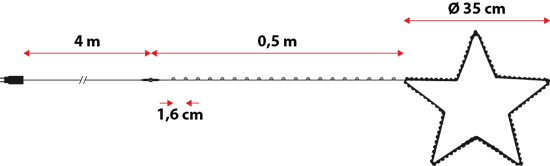 La silueta de la estrella es de metal blanco, se encuentra envuelta por un cable de luces micro led RGB con efecto Multiflash automático no modificable.