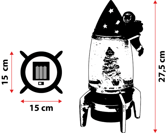 Los peques de la casa se quedarán boquiabiertos con este simpático farol navideño y su resplandor centelleante. La decoración, con forma de cohete, cuenta con un Papá Noel astronauta que intenta trepar por el exterior de la nave espacial. En el interior se puede observar un árbol de Navidad entre los copos de nieve que caen continuamente. Este llamativo efecto se consigue gracias a la purpurina en el agua, que se mueve al encender el farol y la luz de los led se refleja en ellos, haciéndolos brillar.
