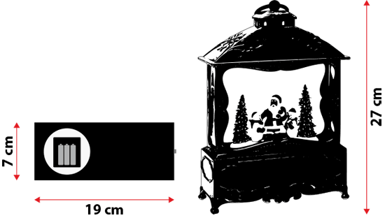 El farol mide 27 cm de alto y 19 cm de ancho. Funciona con 3 pilas AA no incluidas, que se colocan en la base, donde se encuentra un cómodo interruptor ON-OFF.