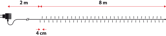 Sobre un cable verde oscuro de 8 metros se encuentran 200 luces Led blanco frío. El color del cable se esconde perfectamente entre las ramas por lo que los Led resaltan en la oscuridad. Al poder usa la guirnalda en exteriores y exteriores, es perfecta para decorar los setos y árboles del jardín.