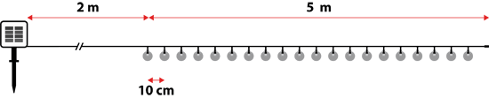 Esta guirnalda luminosa solar de 5 m cuenta con 50 esferas transparentes de 20 mm de diámetro, dispuestas en un cable verde. El color oscuro del cable es ideal para camuflarlo en la oscuridad de la noche, dejando visibles sólo los puntos luminosos
