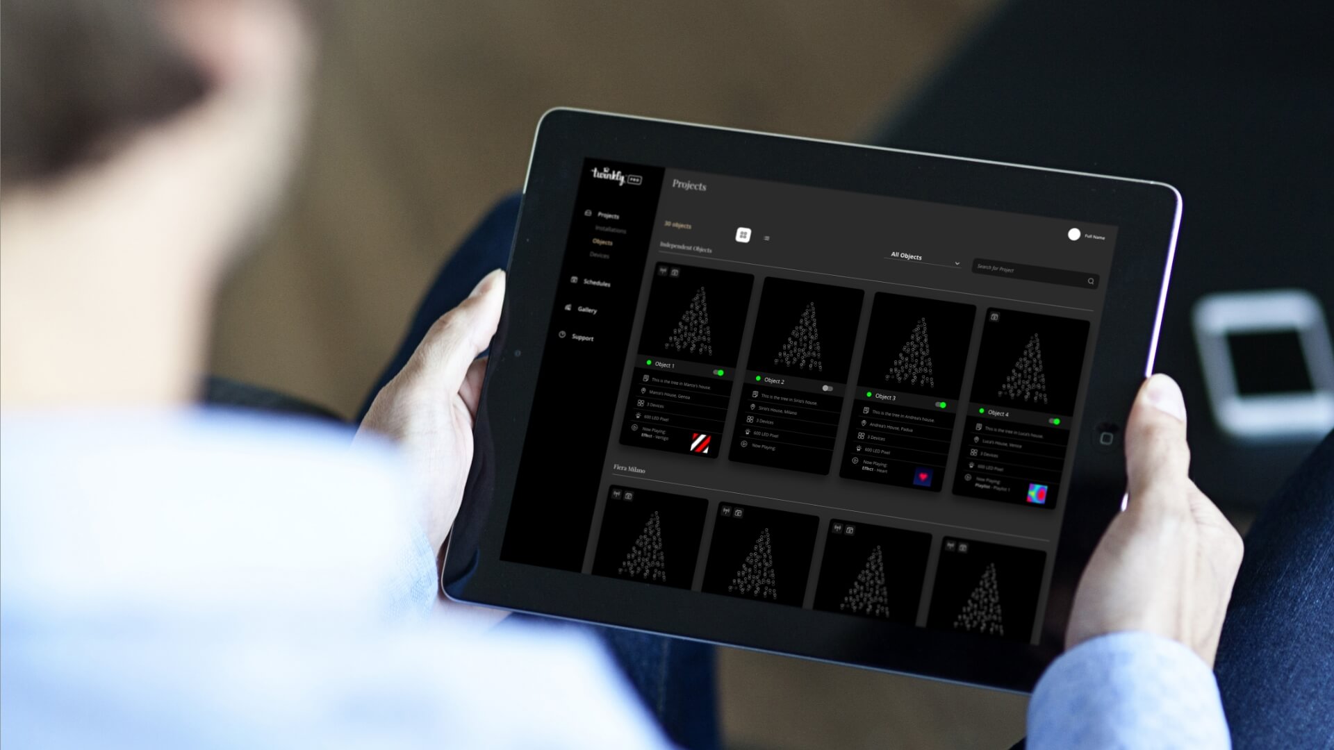 Gracias a la aplicación web Twinkly Cloud Console es posible gestionar de forma remota todas las instalaciones de Twinkly Pro asociadas al usuario en la aplicación Twinkly. En particular, se puede ver todos los dispositivos conectados a la red y ver en tiempo real el efecto que se reproduce en cada uno de ellos.