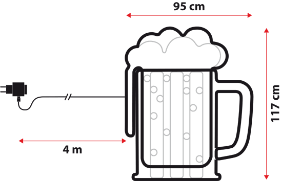 La luz de colores que se proyecta proviene de la combinación de una manguera Led naranja y otra blanco cálido que siluetean la estructura metálica la jarra de cerveza.