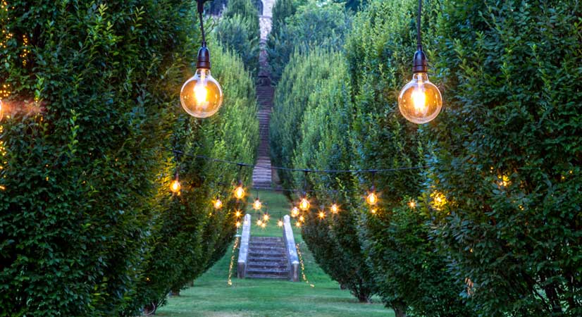 Toda cena nocturna al aire libre necesita una iluminación eficaz, por ello te aconsejamos utilizar guirnaldas de bombillas. Según la intensidad luminosa que necesites podrás elegir bombillas más o menos potentes, incluso regulables.