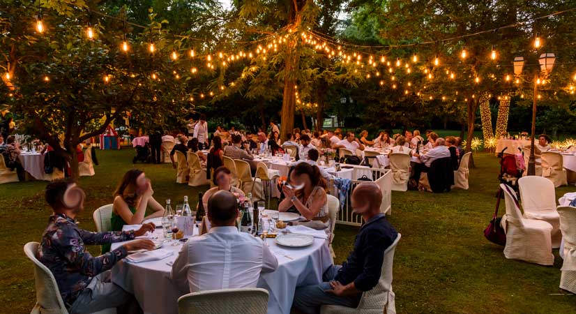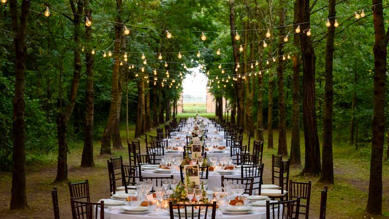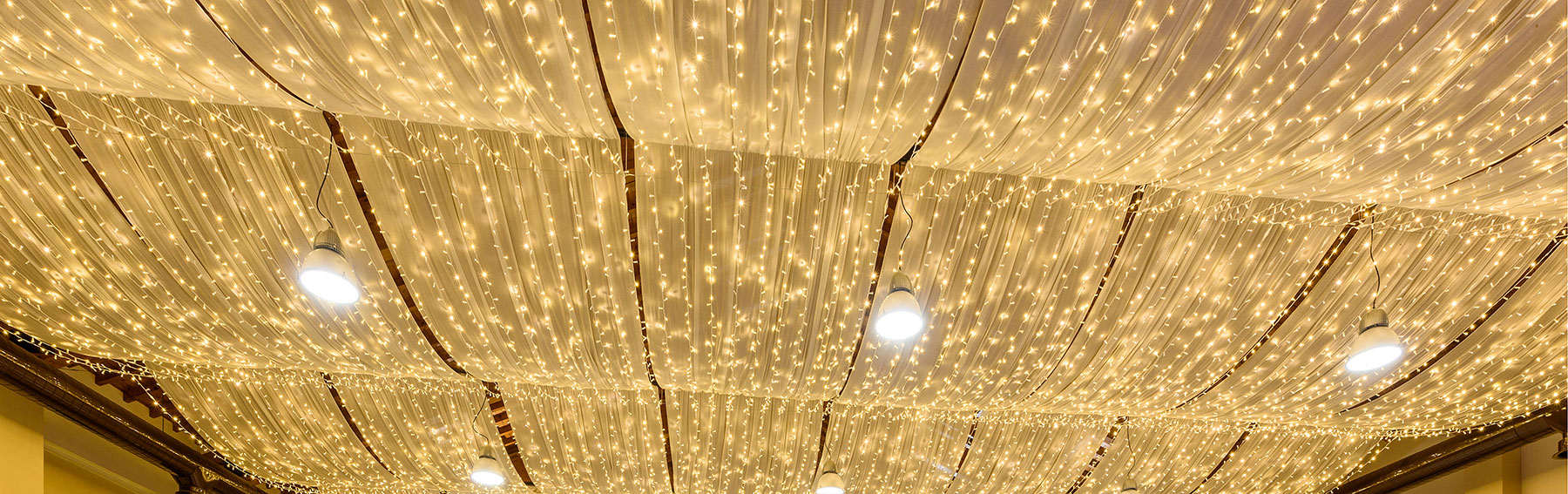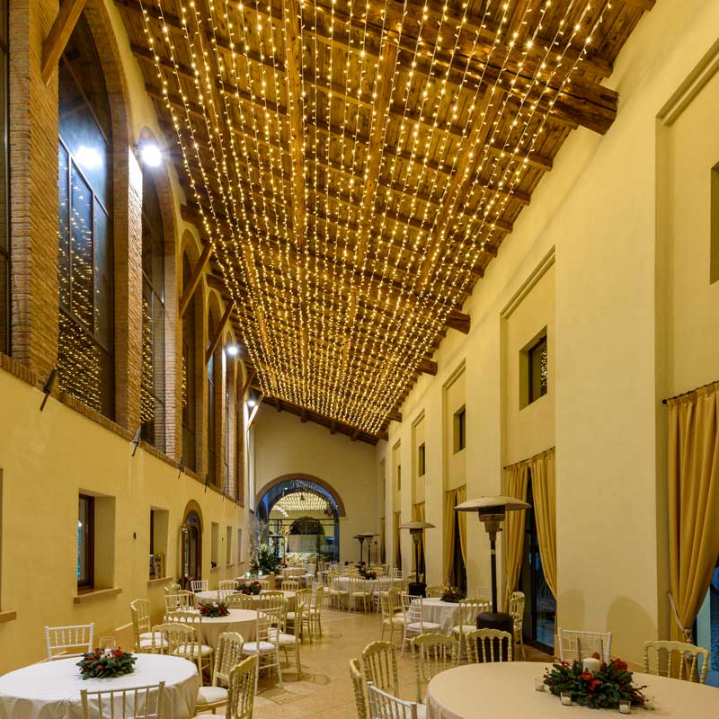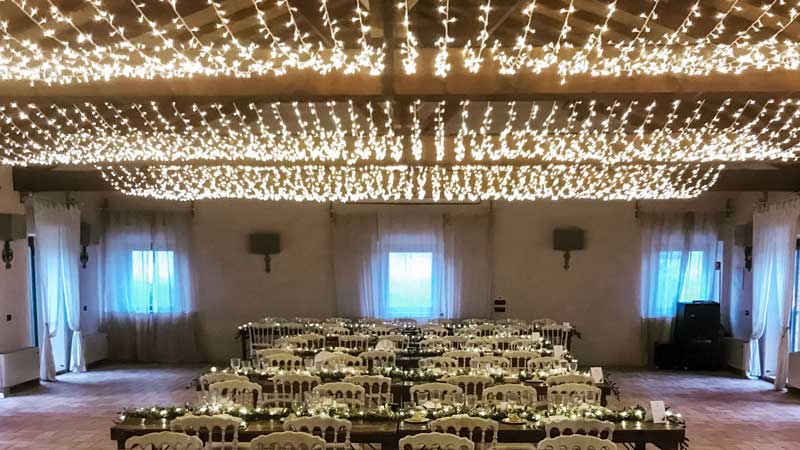 Puede ocurrir que el lugar del banquete esté muy iluminado, imagínate un gran salón donde recibir a los invitados en el interior de una majestuosa finca. En este caso las luces servirán sobre todo para decorar, por ejemplo realizando un techo estrellado que ofrecerá un ambiente agradable y que emocionará a los novios e invitados transmitiéndoles alegría y serenidad.