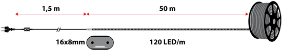 El tubo luminoso de 16 x 8 milímetros está iluminado desde su interior por 6000 luces Led (120 Led/metro). La estructura hace que esta manguera Led sea aún más brillantes que las mangueras de luces tradicionales ya que la luz se difunde de manera uniforme en ambos lados del tubo para crear un efecto final muy elegante que no pasará desapercibido.