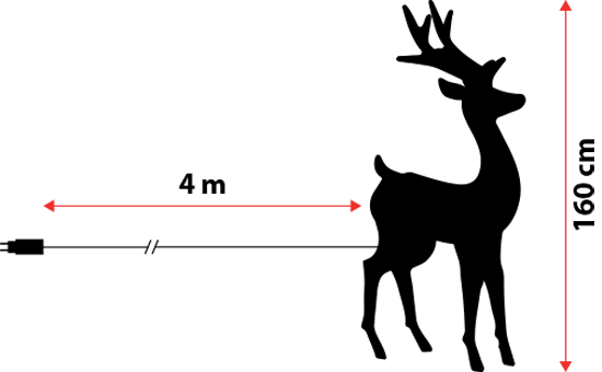 Este reno luminoso está compuesto por un armazón metálico blanco lacado. Se encuentra completamente rodeado por cables de color crema y marrón y lucecitas led color blanco extra cálido con luz fija.