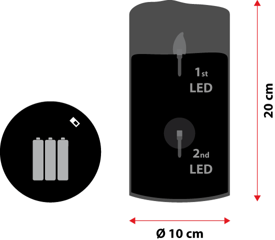 Bougie cylindrique en cire, de 20 cm de haut, ces bords supérieurs sont irréguliers, immitant la fonte de la cire. Une Led brille à l'intérieur et émet un éclairage blanc chaud avec un effet flamme qui se fane et revient en intensité comme une vraie flamme. L'effet lumineux qui en résulte est particulièrement réaliste.