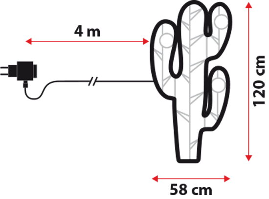 La silhouette en métal blanc du grand cactus est recouverte d'un tube lumineux vert. Ce cactus mesure 1,20 mètre de haut et 58 centimètres de large. La luminosité émise par le tube néon et générée par des led à lumière fixe. La lumière est puissante, intense et homogène visible des deux côtés.
