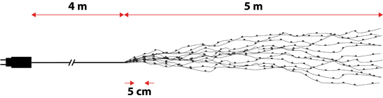 Il s'agit d'une cascade de lumières de 5 mètres de long avec 1500 microleds disposées sur 15 fils de câble métallique argenté. Le câble est fin et flexible, ce qui vous permet de lui donner la forme que vous souhaitez pour votre décoration.
