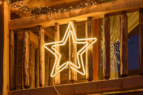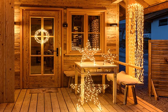 Prédisposer un espace sous le portique pour des moments de condivision en le décorant avec des lumières de Noël.