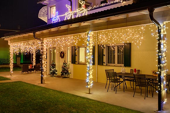 Guirlandes lumineuses led et stalactites pour illuminer les colonnes et le rebord de la toiture