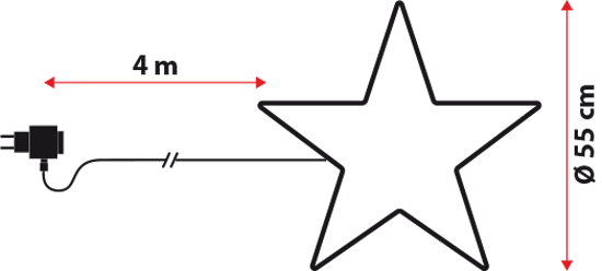 L'étoile mesure 55 cm de diamètre et sa structure est en métal peint en blanc et revêtue par un tube led à effet pointillé.