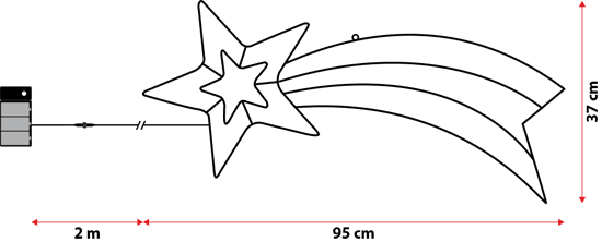Cette étoile filante lumineuse à effet glacé, de 95 cm de long et 37 cm de haut, est éclairée par 90 LED blanc froid. Certaines LED ont une lumière fixe, d'autres clignotent; dans ce cas, le jeu de lumière ne peut pas être modifié.