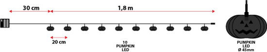 Cette guirlande lumineuse mesure 1,8 m de long et est décorée avec 10 citrouilles. Chacune des citrouilles contient une Led à lumière fixe à l'éclairage blanc froid; un câble noir les relient les unes au autres..