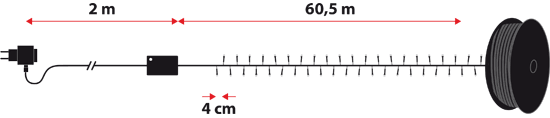La guirlande a une longueur de 60,5 mètres et se compose de 1500 LED multicolor sur un câble vert. Distance entre les leds est de 4 centimètres.