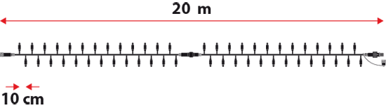Guirlande lumineuse professionnelle pour une utilisation intérieure et extérieure avec des diodes MaxiLeds RGB changeants de couleur. La guirlande possède 200 LED très lumineuses (7 mm de diamètre) sur une longueur totale de 20 mètres. Elle peut être divisée en 2 parties de 10 mètres grâce aux connecteurs intégrés.