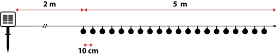 Cette guirlande solaire de 5 m possède 50 sphères blanches de 20 mm de diamètre, disposées sur un câble noir. Grâce à son câble fonçé le fils semble disparaître dans l'obscurité, laissant visible uniquement les points lumineux qui ressortiront ainsi encore plus.
