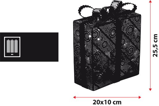 Ce paquet cadeau lumineux est alimenté par 3 piles AA (non incluses) qui doivent être insérées dans le porte-piles à la base.