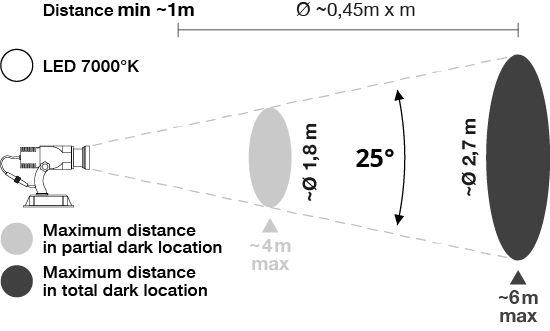 - Surface illuminée: min Ø 0,45m, max 2,7m