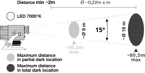 Si la surface n'est pas complètement dans le noir, nous vous suggérons de rapprocher le projecteur et de le positionner à une distance maximale de 40 mètres. L'image projetée aura un diamètre d'environ 9 mètres et sera clairement visible à l'œil nu.