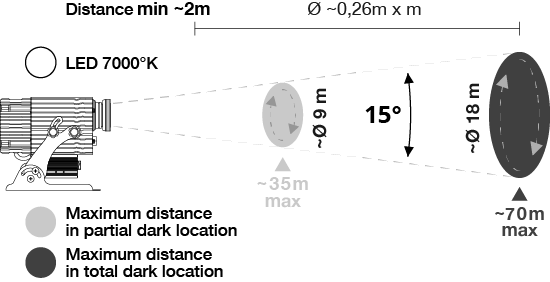 Si la surface n'est pas complètement dans le noir, nous vous suggérons de rapprocher le projecteur et de le positionner à une distance maximale de 35 mètres. L'image projetée aura un diamètre d'environ 9 mètres et sera clairement visible à l'œil nu.