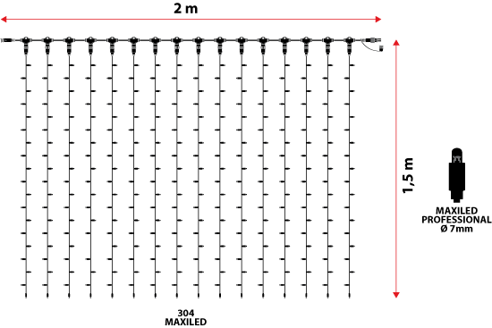 Rideau lumineux de 2 m de largeur et 1,5 m de hauteur. Les 304 Maxiled (diamètre 7 mm) assurent un'intensité lumineuse extraordinaire avec un impact déco impressionant.