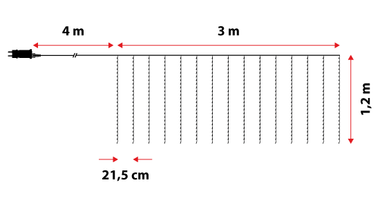 Le rideau est doté de 360 LED blanc chaud de 5 mm de diamètre, disposées verticalement le long d'un fil transparent. Cette disposition des LED permet de mettre en valeur l'effet de chute de neige.