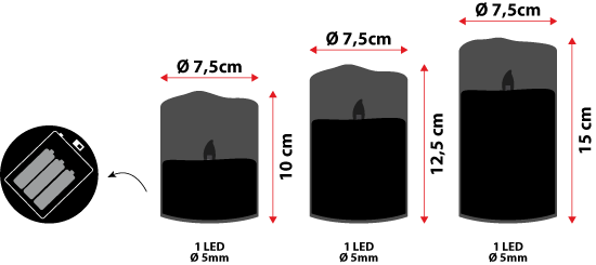 Grâce à son fonctionnement à piles (3 piles AAA, piles non incluses) ces bougies peuvent être placées partout où vous voulez, sans contraintes d'un branchement aux prises électriques.
