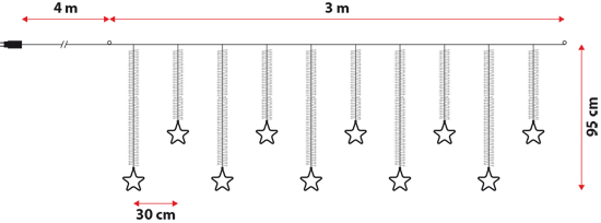 Cette stalactite est composée de 350 MiniLeds Ø 3 mm + 580 LED néon SMD. La lumière émise par les 350 LED fixes et clignotantes blanc chaud et blanc froid de cette stalactite s'étend sur 3 mètres de large. Les tombées, espacées de 30 cm l'une de l'autre, ont des longueurs différentes (75 et 105 cm).