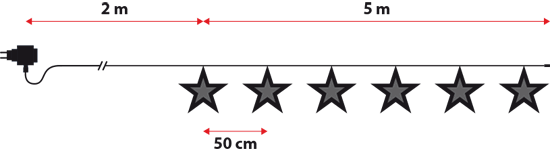 La catena è lunga 5 metri, ha 11 stelline led in plastica (diam. di 14 mm) illuminate da led bianco extra caldo a luce fissa.