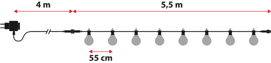 La catenaria è lunga 5,5 metri e ha 10 lampadine a goccia in plastica bianca satinata.