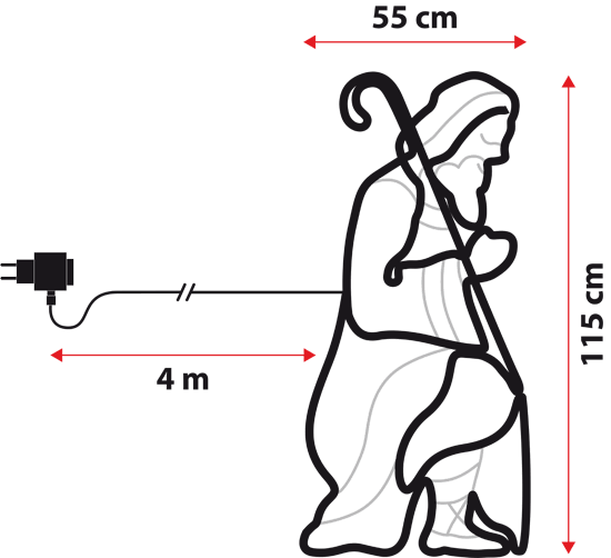 Realizzata in metallo e rivestita con un tubo luminoso di 7,5 metri bianco caldo a luce fissa, la figura di Maria ha un'altezza di 115 e una larghezza di 55 centimetri.