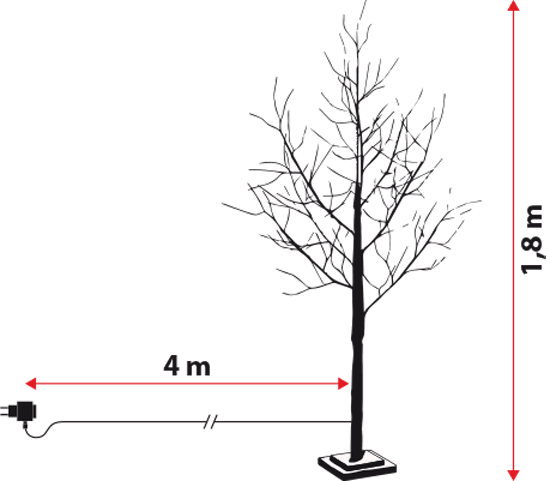 Alto 180 centimetri, ha una decina di rami su cui sono disseminati micro led per un totale di 600 piccoli punti luce a forma di goccia. I led emanano una luce calda fissa.