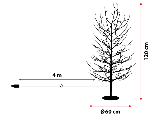 Questo albero è alto 120 centimetri e presenta una serie di rami che si diramano dal tronco, i quali sono modellabili grazie all'anima in metallo che li attraversa, così da poterlo adattare alle esigenze della propria decorazione. Inoltre, grazie alla sua apertura, questo albero può raggiungere un diametro di 60 centimetri, conferendo un effetto visivo davvero notevole.