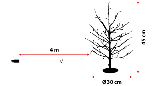 Questo albero è alto 45 centimetri e presenta una serie di rami che si diramano dal tronco, i quali sono modellabili grazie all'anima in metallo che li attraversa, così da poterlo adattare alle esigenze della propria decorazione. Inoltre, grazie alla sua apertura, questo albero può raggiungere un diametro di 30 centimetri, conferendo un effetto visivo davvero notevole.