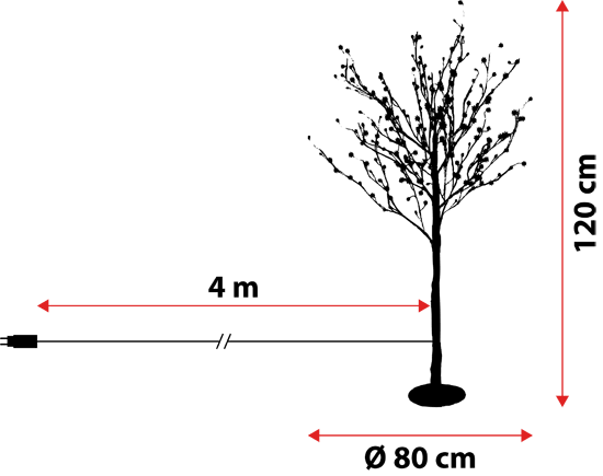 E' dotato di una comoda base in metallo che si può asportare, se ad esempio vuoi porre il ramo dentro ad un vaso, e un cavo di alimentazione lungo 4 metri con il trasformatore già inserito, consentendo di posizionarlo ovunque desideri. Puoi usare l'albero solo all'interno.