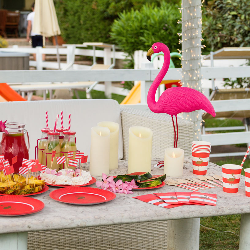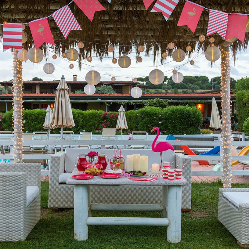 Dopo il boom dei fenicotteri rosa ne avrai sicuramente uno a casa, da riciclare come addobbo di tendenza per il tuo party in piscina. Anche noi ne avevamo uno, a cui abbiamo trovato posto sotto un gazebo, arredato con alcuni divani e un tavolino.