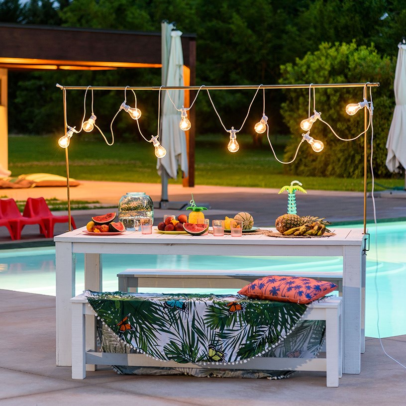 Ricorri alle catene di lampadine per illuminare il tavolo in giardino: le loro luci soffuse e ben distribuite fanno sì che il pool party continui fino alle prime ore del mattino.