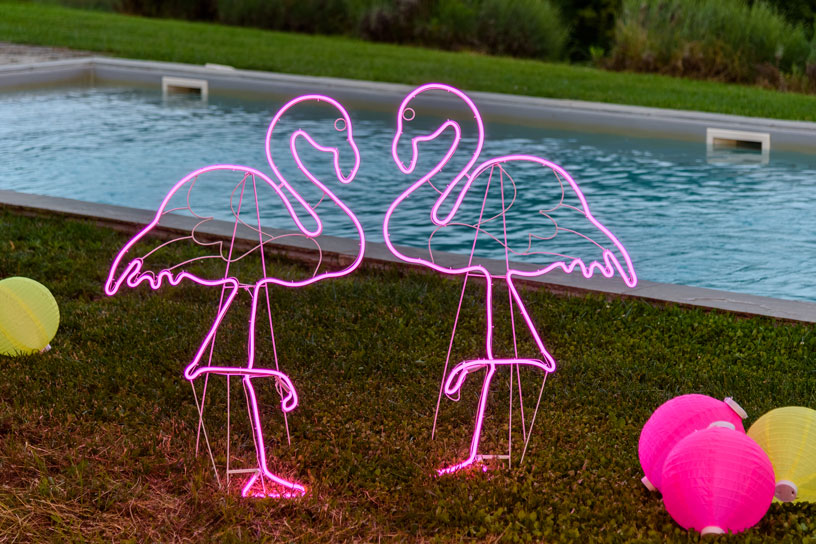 Punta tutto sulle lampade neon a forma di palma e fenicottero. Essendo riprodotte a grandezza naturale, riempiono facilmente gli spazi e grazie alla loro luminosità intensa, attirano l’attenzione degli ospiti;