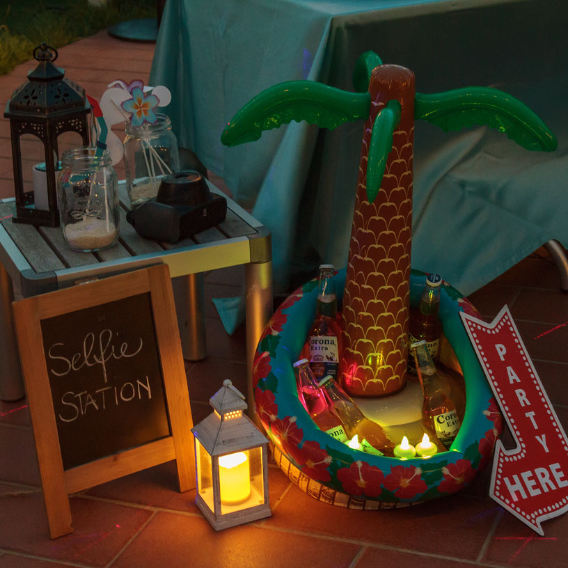 Abbiamo allestito un tavolo buffet – grande attrazione della festa – valorizzandolo con una tovaglia del colore dell’acqua e addobbi in stile tropicale, per dare un’aria spensierata all'ambiente;